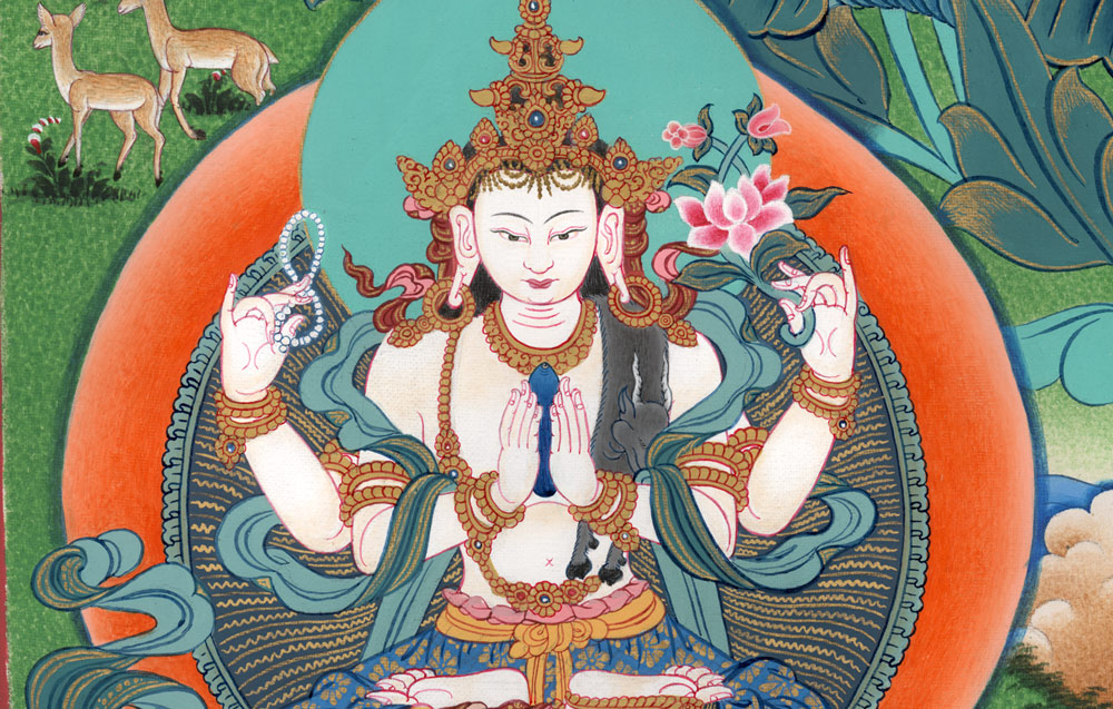 This puja is the Four-Armed Chenrezig practice, performed for the benefit of all sentient beings. Chenrezig embodies the enlightened speech of all the Buddhas and is the manifestation of their boundless compassion. This particular liturgy is among the most widely practiced and beloved Chenrezig practices in Tibet.